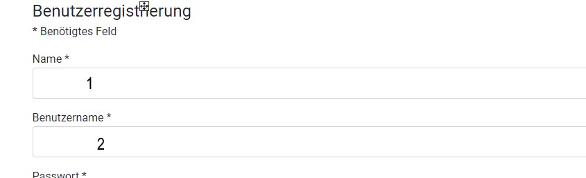 Bei der Benutzerregistrierung wird zwischen "Name" (1) und "Benutzername" (2) unterschieden.